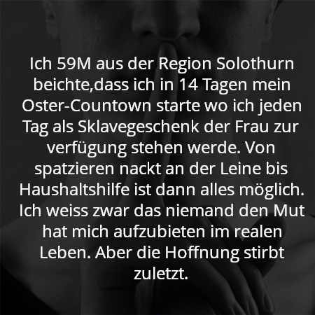 Ich bin ein Nackter Sklave aus der Region Solothurn der gerne einer Frau zur verfügung steht. Bitte keine Fakeleute und Tastenwixer die nichts reales suchen. Wer unfähig ist eine Mailadresse oder t******* Infos zu senden brauche ich nicht.Beichten, Chatten, Daten